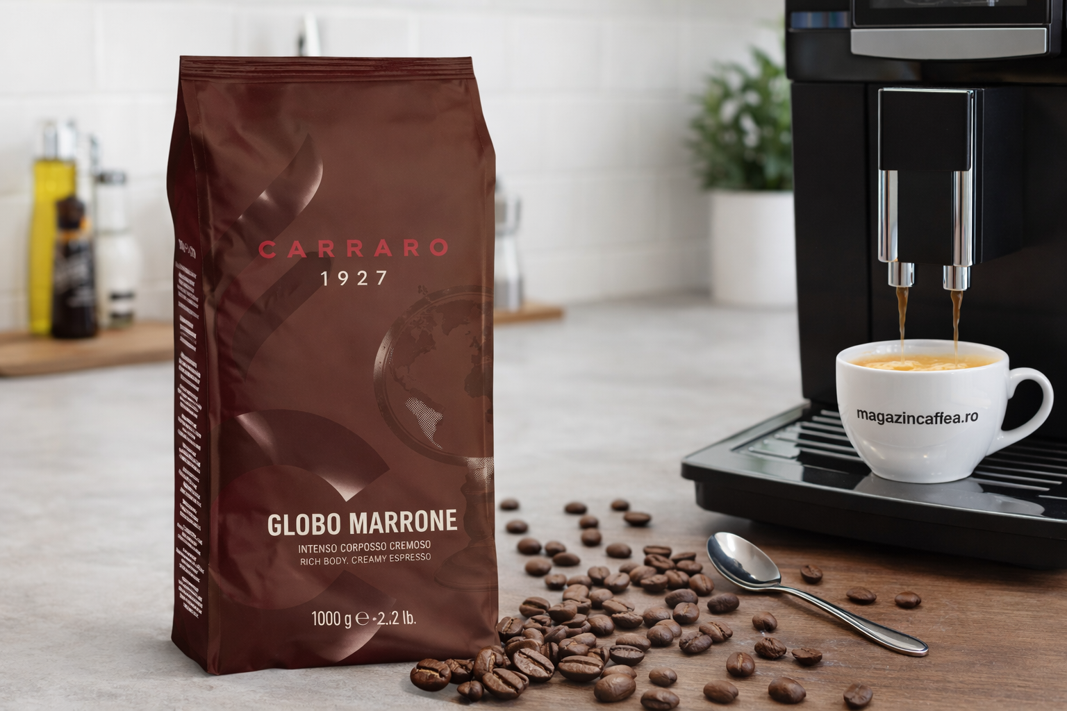 Carraro Globo Marrone oferă un profil aromatic intens, dominat de note de cacao, ciocolată neagră și accente ușor prăjite. Componenta Robusta contribuie la un plus de structură și la formarea unei creme dense și stabile.