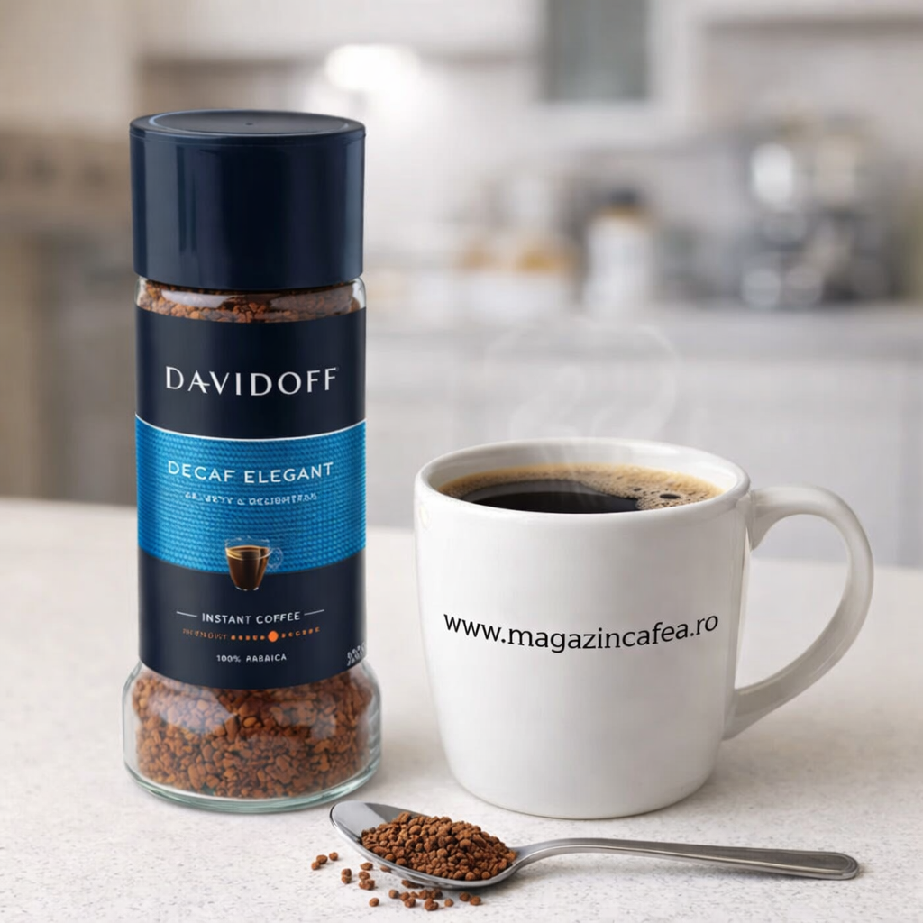 Davidoff Decaf Elegant este o cafea instant premium decofeinizată, realizată din boabe 100% Arabica atent selecționate și prăjite mediu pentru a oferi un gust echilibrat și rafinat. Concepută pentru cei care își doresc aroma autentică a cafelei, dar fără efectul stimulant al cofeinei, această variantă păstrează profilul aromatic specific brandului Davidoff: fin, catifelat și armonios.