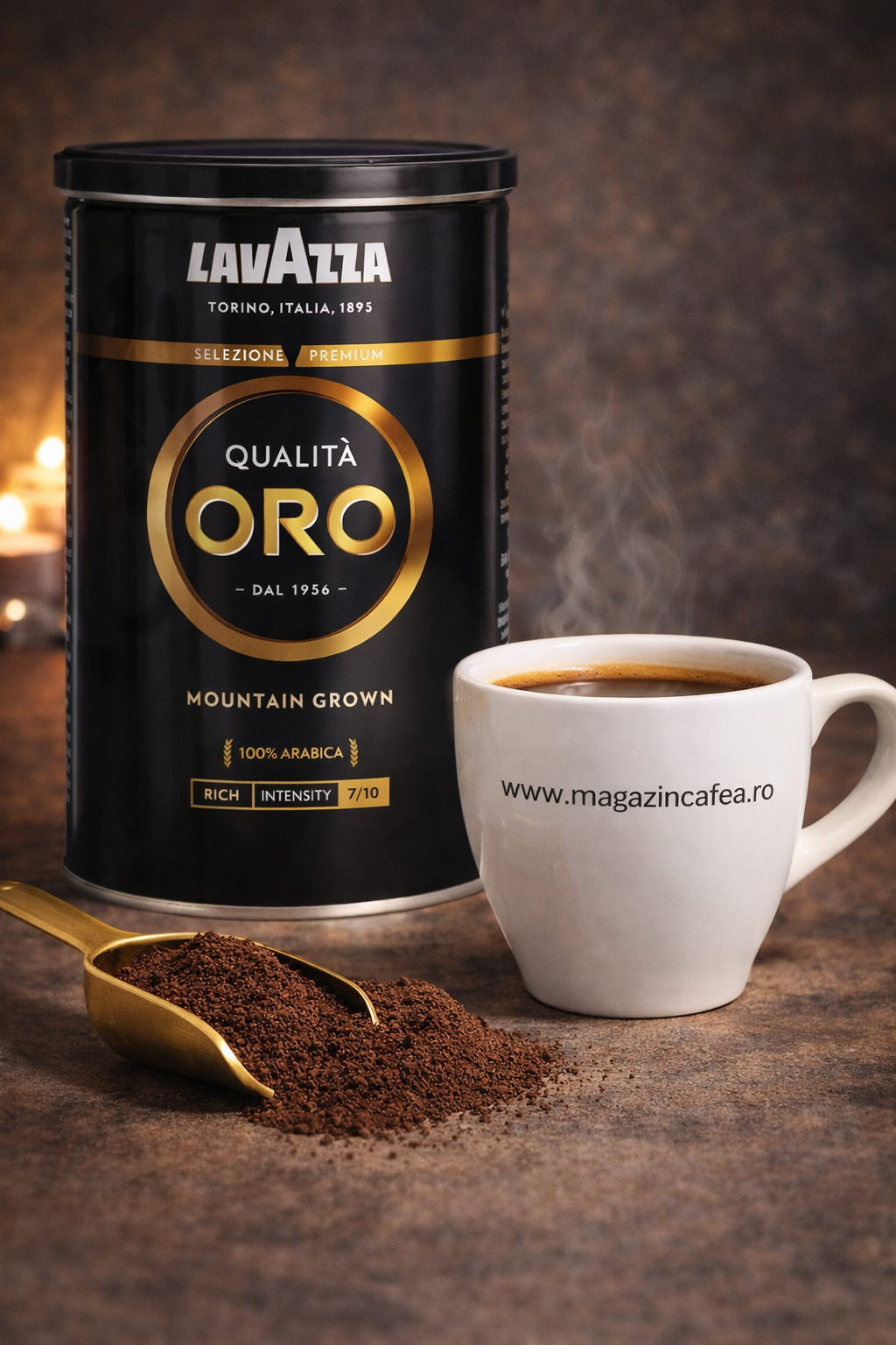 Este o cafea măcinată premium, 100% Arabica, realizată din boabe cultivate la altitudini ridicate.