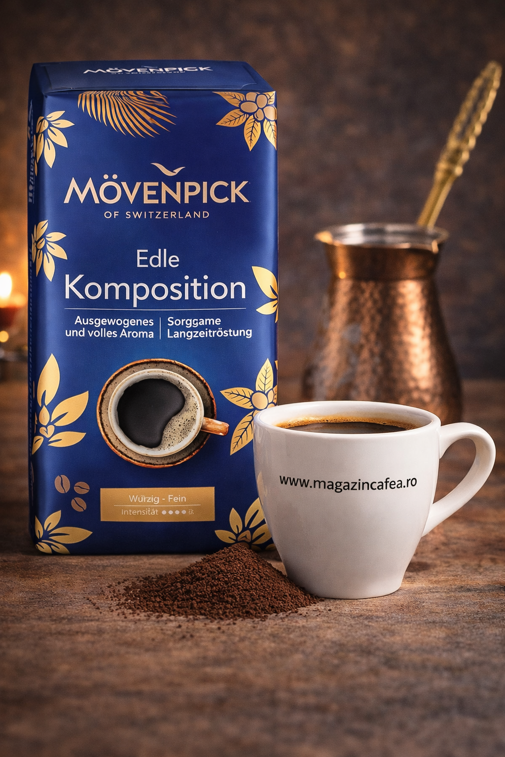 Mövenpick Edle Komposition este o cafea măcinată premium, creată dintr-un amestec rafinat de boabe Arabica si Robusta, provenite din cele mai bune regiuni de cultivare din lume. Acest sortiment îmbină eleganța gustului cu intensitatea echilibrată, oferind o experiență senzorială bogată, potrivită pentru adevărații cunoscători.