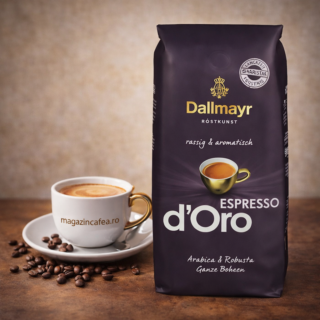 Acesta este un pachet de cafea boabe premium, marca Dallmayr, gama Espresso d’Oro, destinat consumului zilnic sau utilizării profesionale.