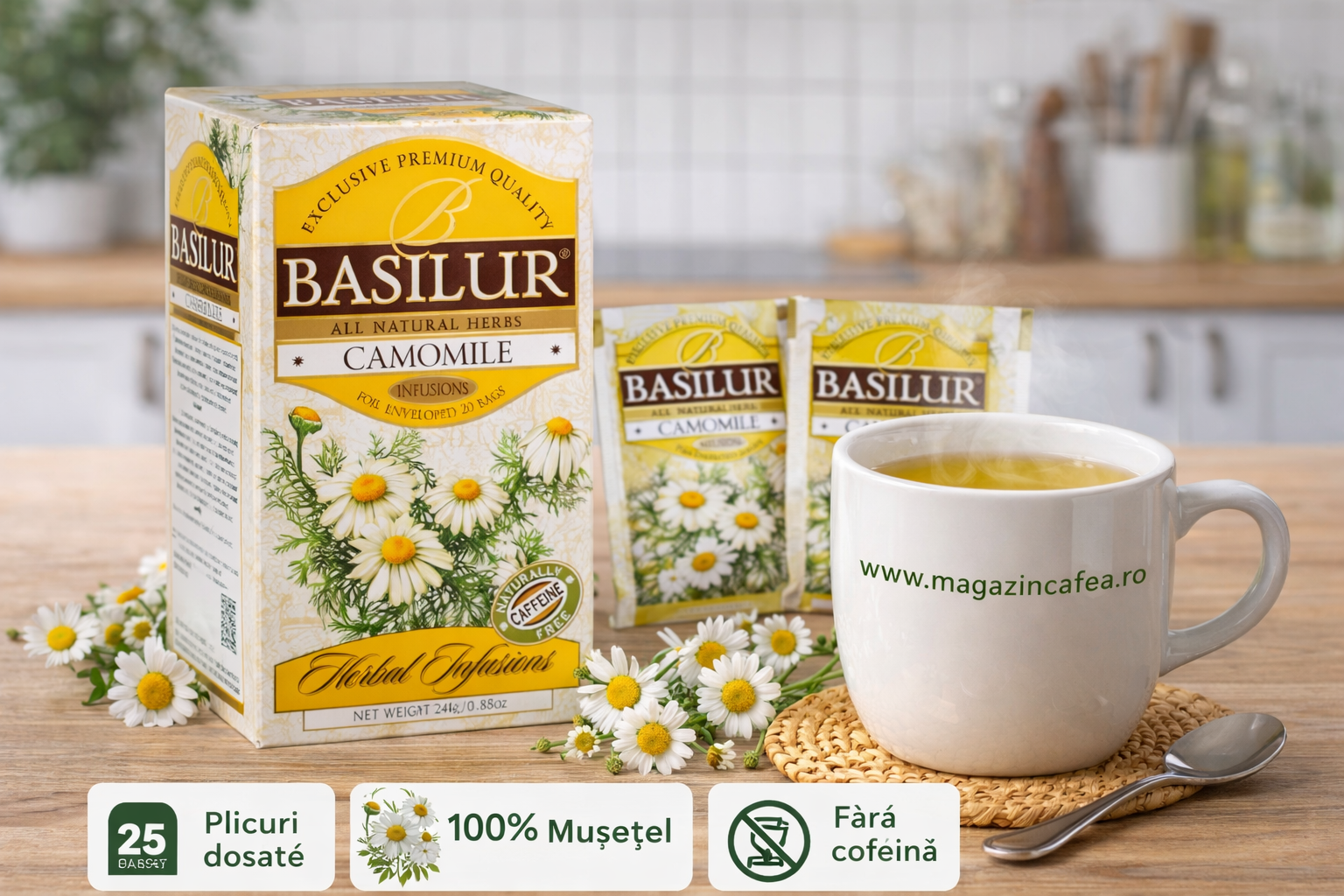 Ceaiul de mușețel Basilur 25 plicuri este o infuzie din flori de mușețel atent selecționate, ambalate individual pentru păstrarea prospețimii și dozare practică. Este o alegere potrivită pentru cei care preferă ceaiurile din plante, fără cofeină, cu profil aromatic floral și gust ușor dulceag natural.