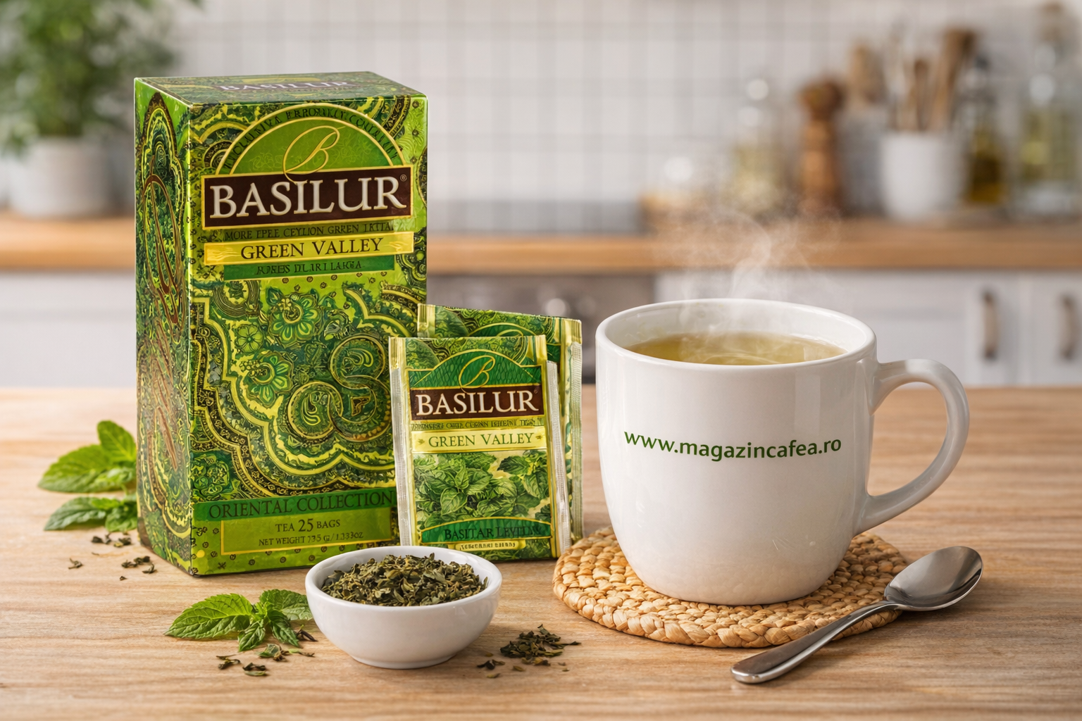 Ceaiul verde Basilur Green Valley 25 plicuri este o selecție de ceai verde atent procesat pentru a păstra prospețimea frunzelor și profilul aromatic natural. Ambalat în plicuri individuale, oferă dozare practică și preparare rapidă, fiind potrivit atât pentru acasă, cât și pentru birou.