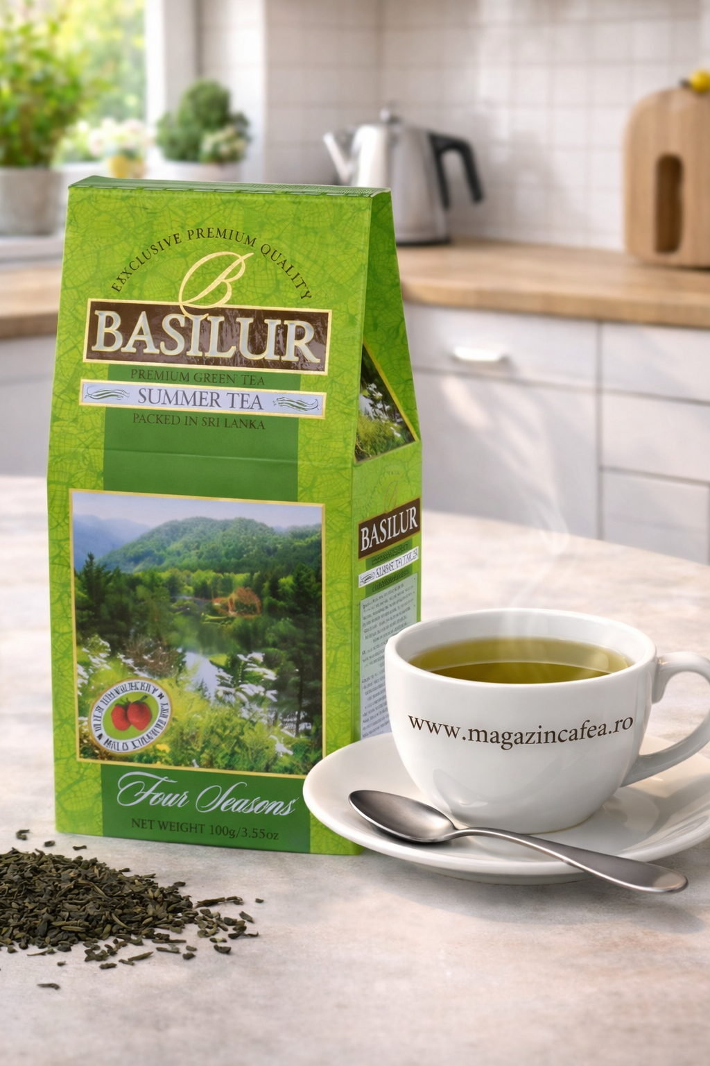 Ceaiul verde Basilur Summer Tea oferă un gust proaspăt, ușor vegetal, cu final echilibrat.