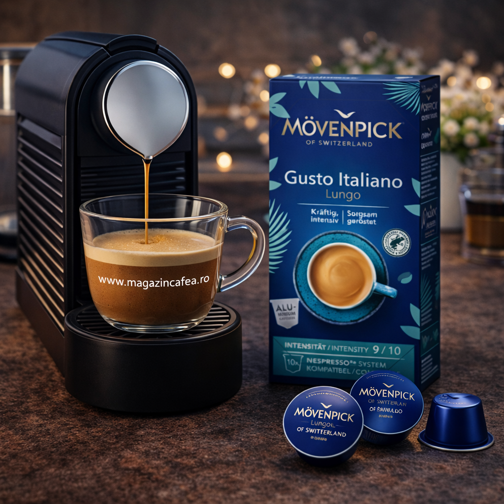 Mövenpick Gusto Italiano aduce acasă esența espresso-ului autentic italian. Fiecare capsulă conține un amestec echilibrat de boabe Arabica și Robusta, prăjite lent pentru a obține o băutură cu corp plin, aromă puternică și gust intens, exact cum este apreciat în cafenelele din Italia.