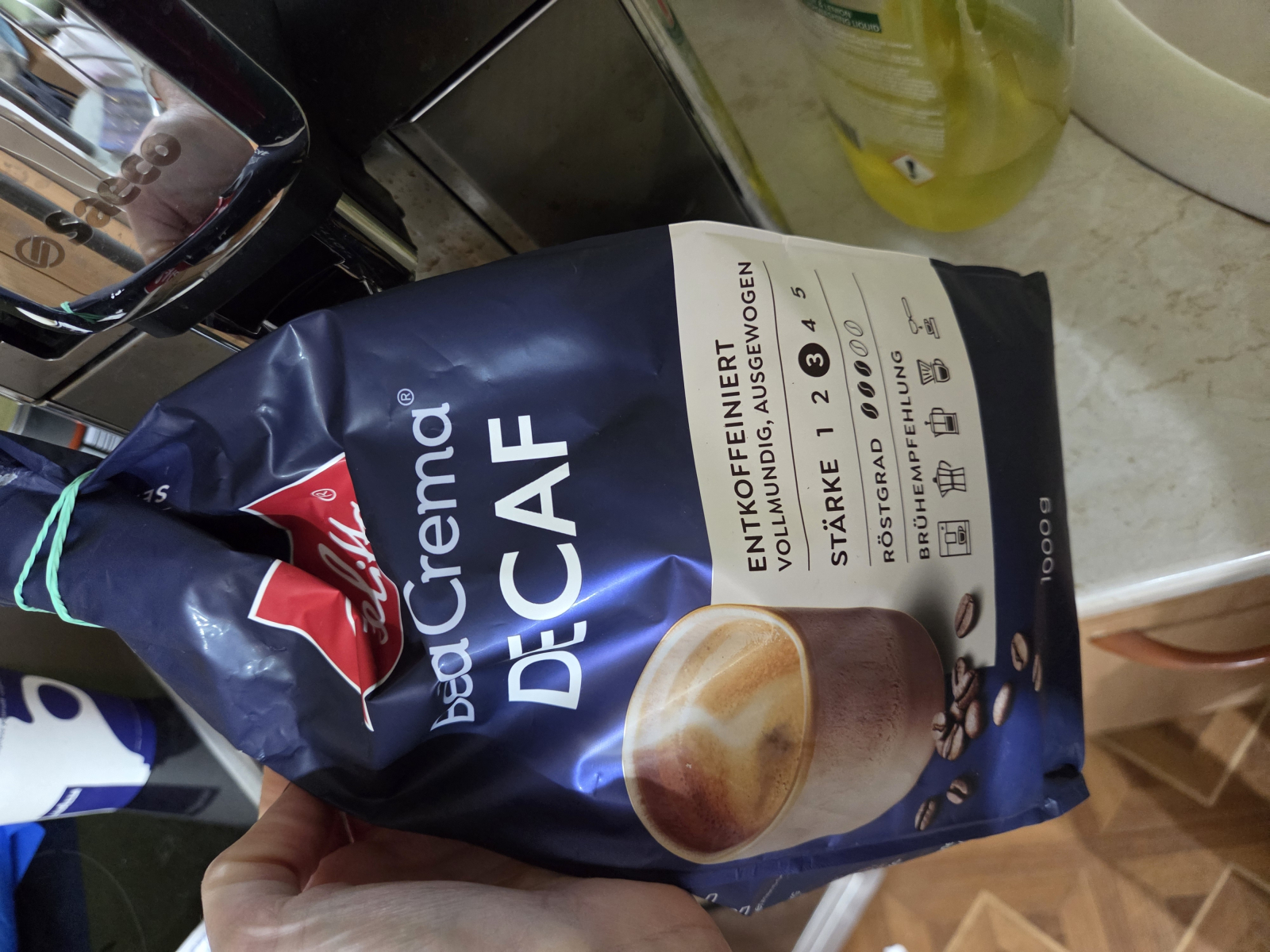 Melitta Bella Crema Decaffeinato cafea boabe 1 kg este o cafea boabe desăvârșită. Vreți să vă lipsiți de cofeină, dar cu siguranță nu și de o cafea bună? Nicio problemă cu BellaCrema® Decaffeinato! Aromă de cafea cu intensitate italiană, cu o ușoară dulceață și aromă de fructe, totul fără cofeină. Perfect pentru o cafea seara și pentru toți cei care vor să renunțe la cofeină.
