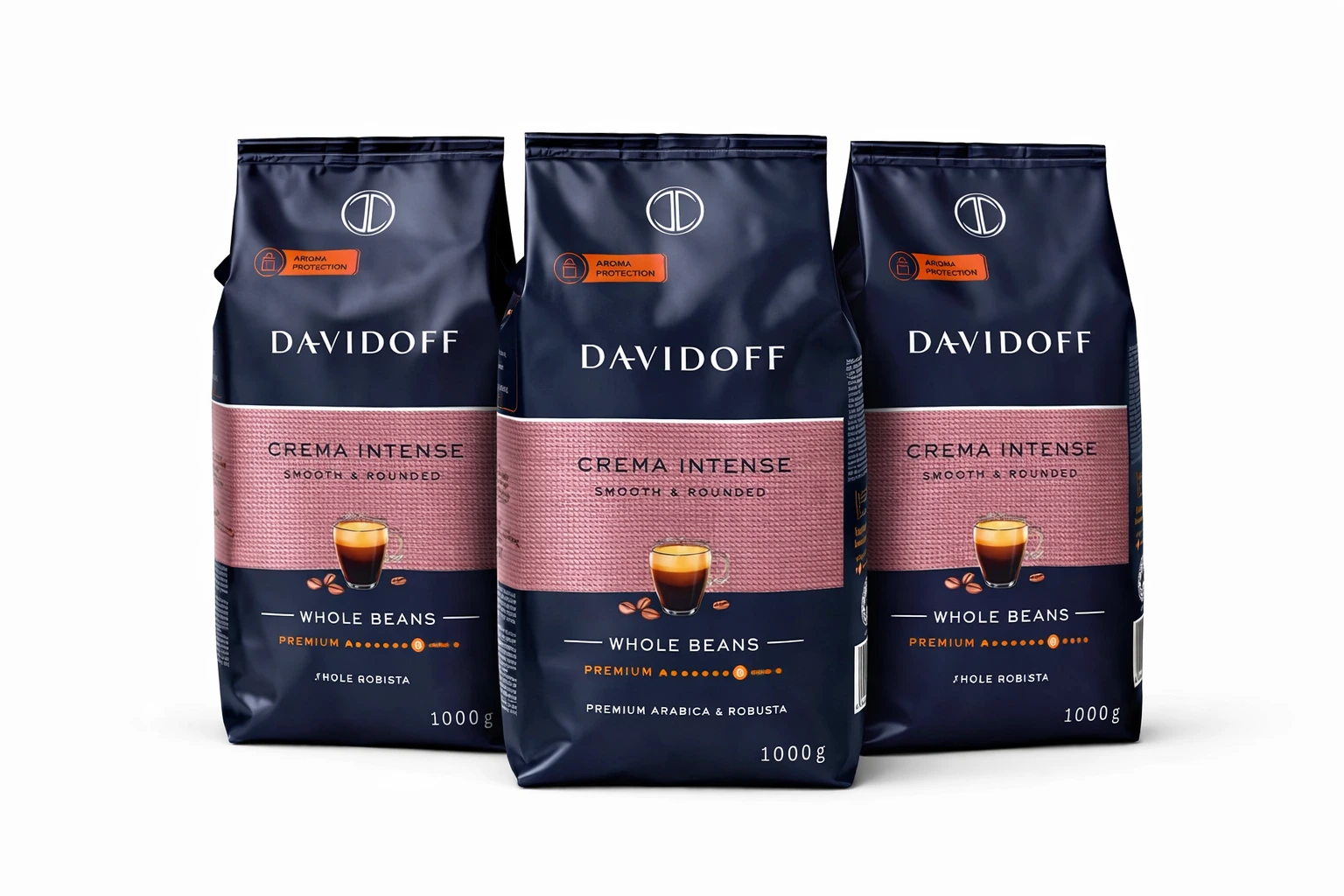 Pachetul conține 3 pungi de Davidoff Crema Intense cafea boabe, fiecare de 1 kg.