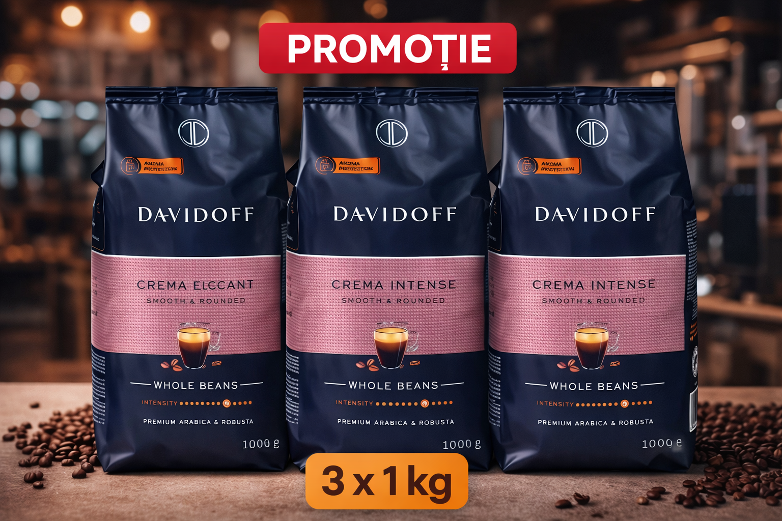 Pachet promoțional 3 x Davidoff Crema Intense cafea boabe 1 kg, cu aromă intensă, cremă bogată și gust rafinat. Ideal pentru consum frecvent și economie pe termen lung.