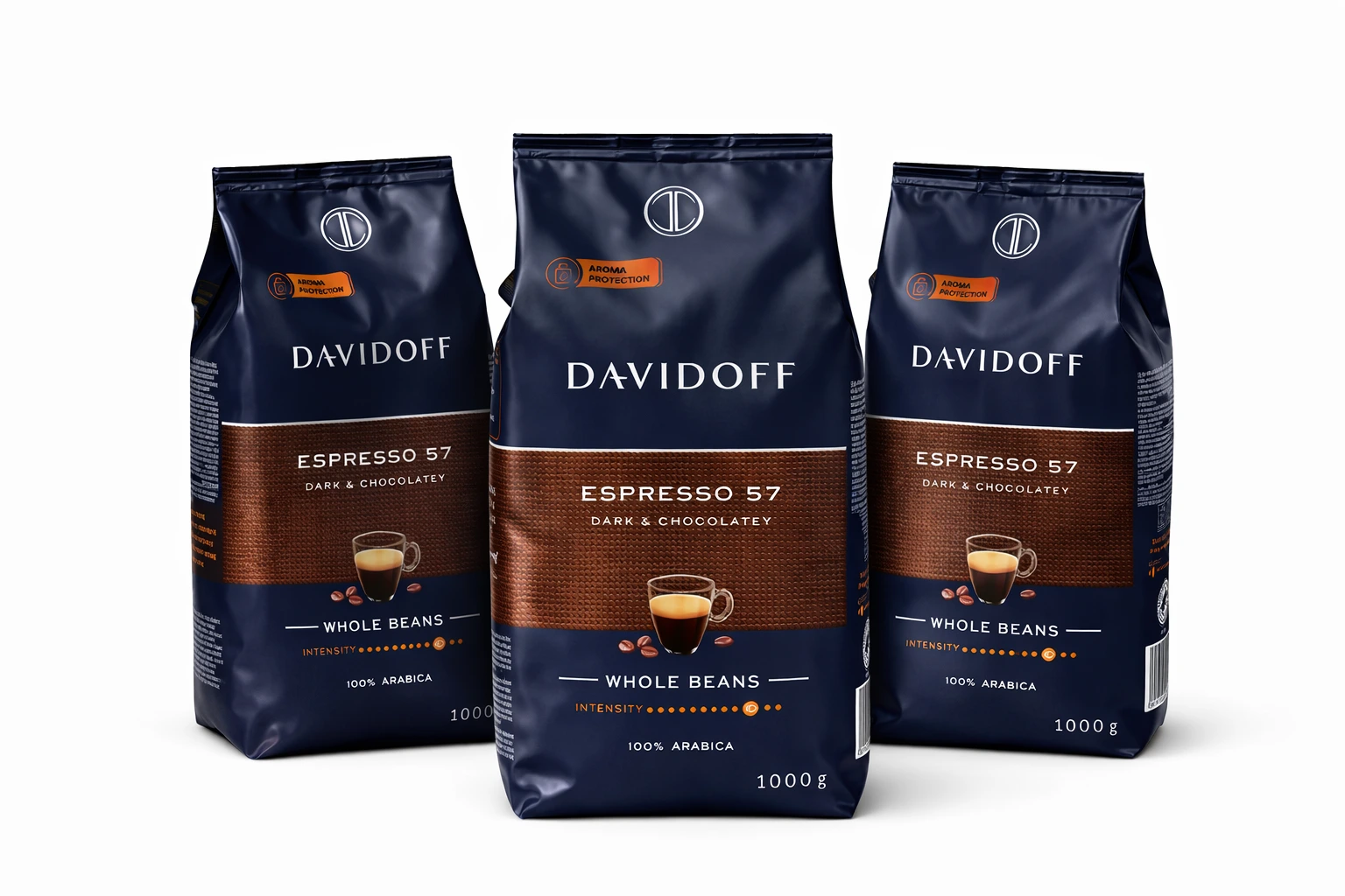Pachetul conține 3 pungi de Davidoff Café Espresso 57 cafea boabe, fiecare de 1 kg.