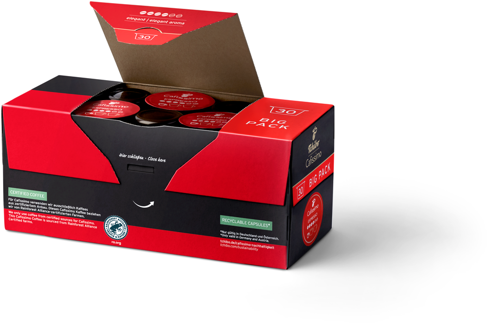 Tchibo Cafissimo Espresso Elegant Aroma este un sortiment dedicat iubitorilor de espresso echilibrat și rafinat. Realizat dintr-un amestec 100% Arabica, atent prăjit pentru a evidenția aromele fine, acest espresso oferă un gust plăcut și o cremă densă.